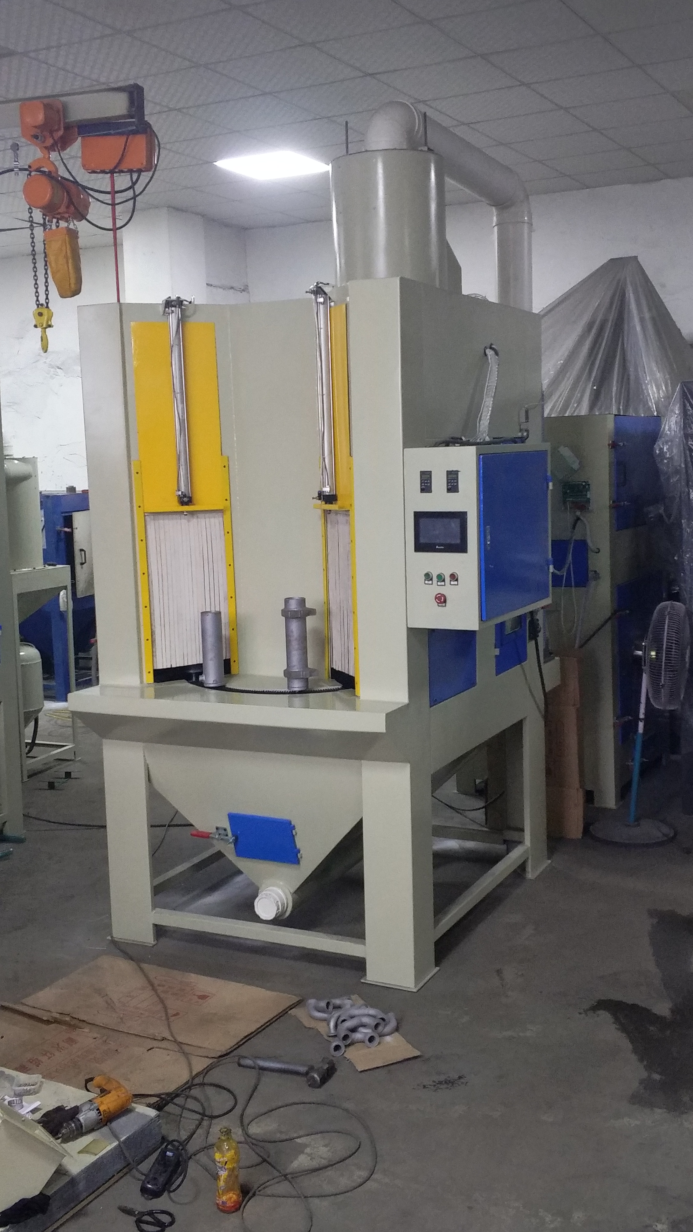 3、本轉盤機是針對回轉類加工產品依據夾具的制做及噴槍的位置,可一次性對產品的內外表面進行噴砂。